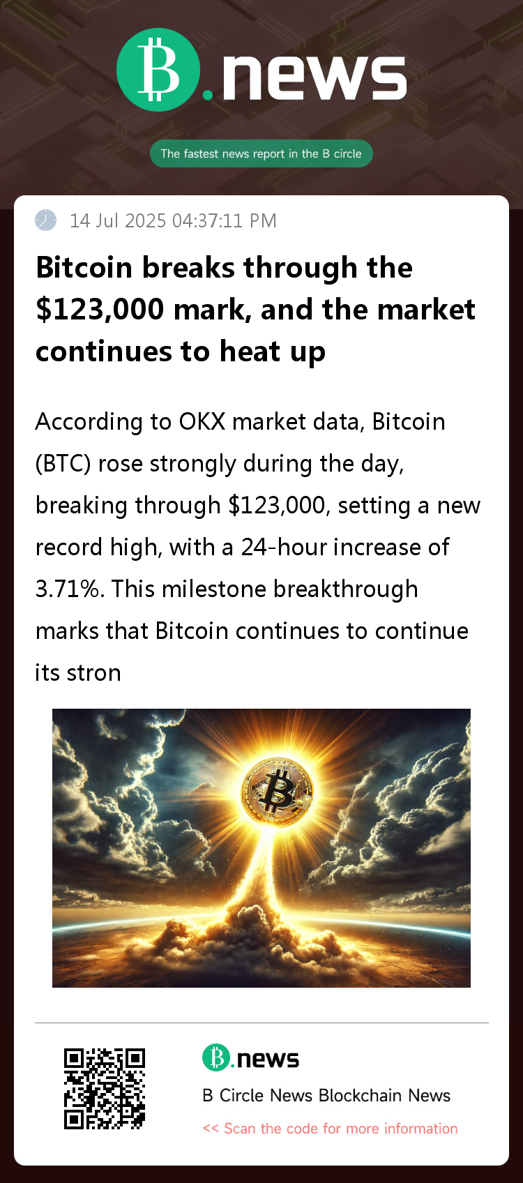 According to OKX market data, Bitcoin (BTC) rose strongly during the day, breaking through $123,000, setting a new record high, with a 24-hour increase of 3.71%. This milestone breakthrough marks that Bitcoin continues to continue its strong upward trend this year under the joint promotion of a new round of institutions and retail investors.
