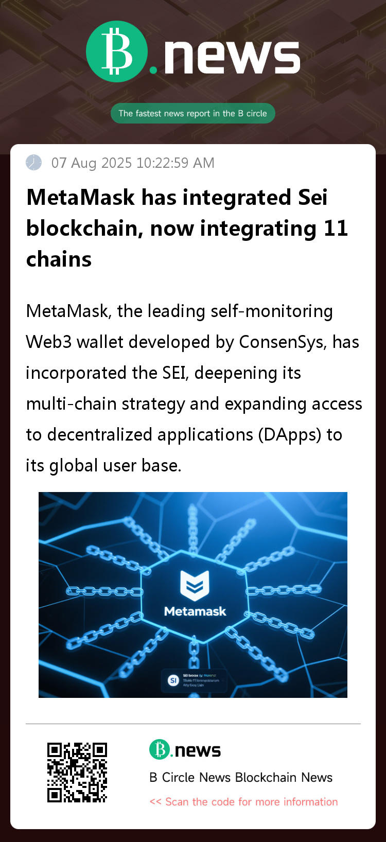 MetaMask announced that it has integrated the Sei blockchain, bringing the total number of supported blockchains to 11. This integration will bring native support for the Sei network to MetaMask, enabling MetaMask users to seamlessly access Sei's decentralized application (DAPP) ecosystem and Sei native assets within the wallet.