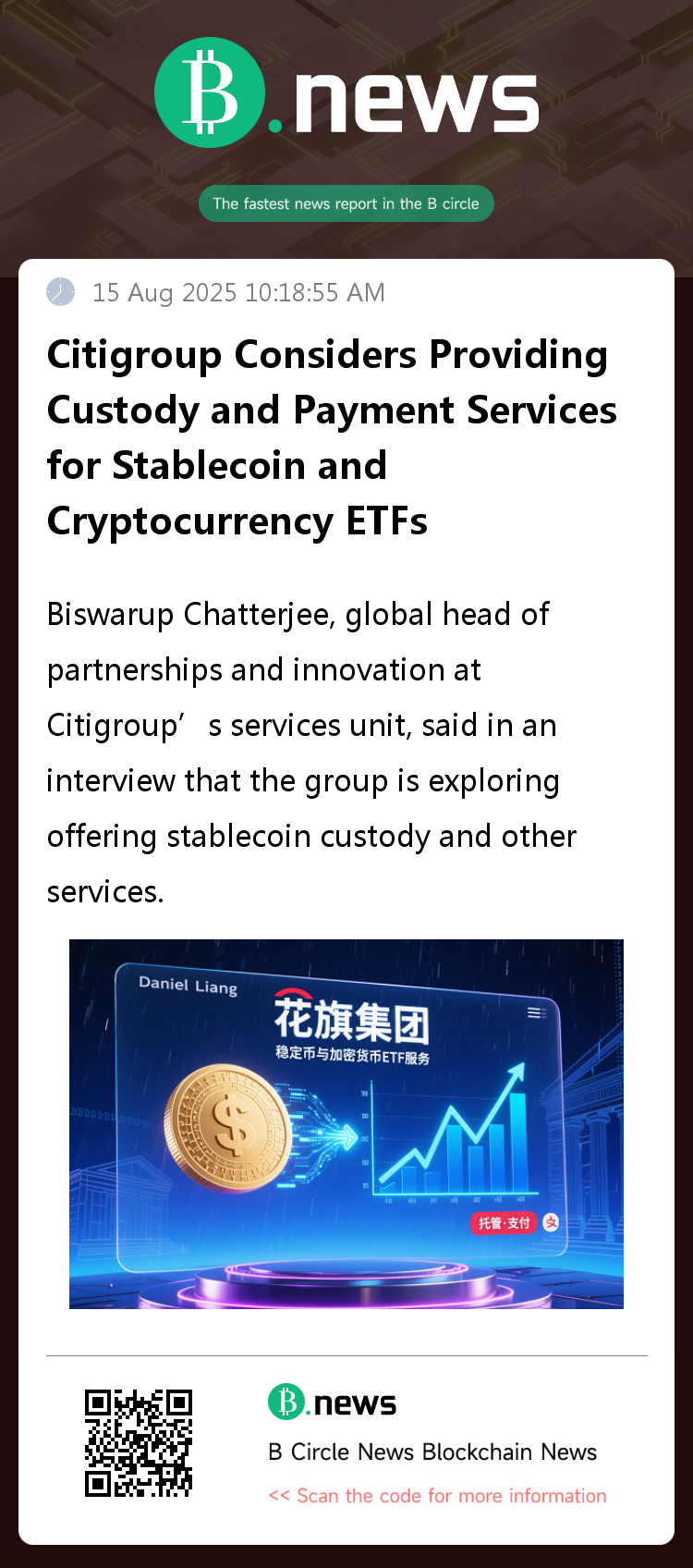 On August 15th, Reuters reported that Biswarup Chatterjee, global head of partnerships and innovation at Citigroup's services division, said in an interview that the group is exploring the provision of stablecoin custody and other services. Citigroup is also exploring the provision of custody services for digital assets that support cryptocurrency-related investment products.