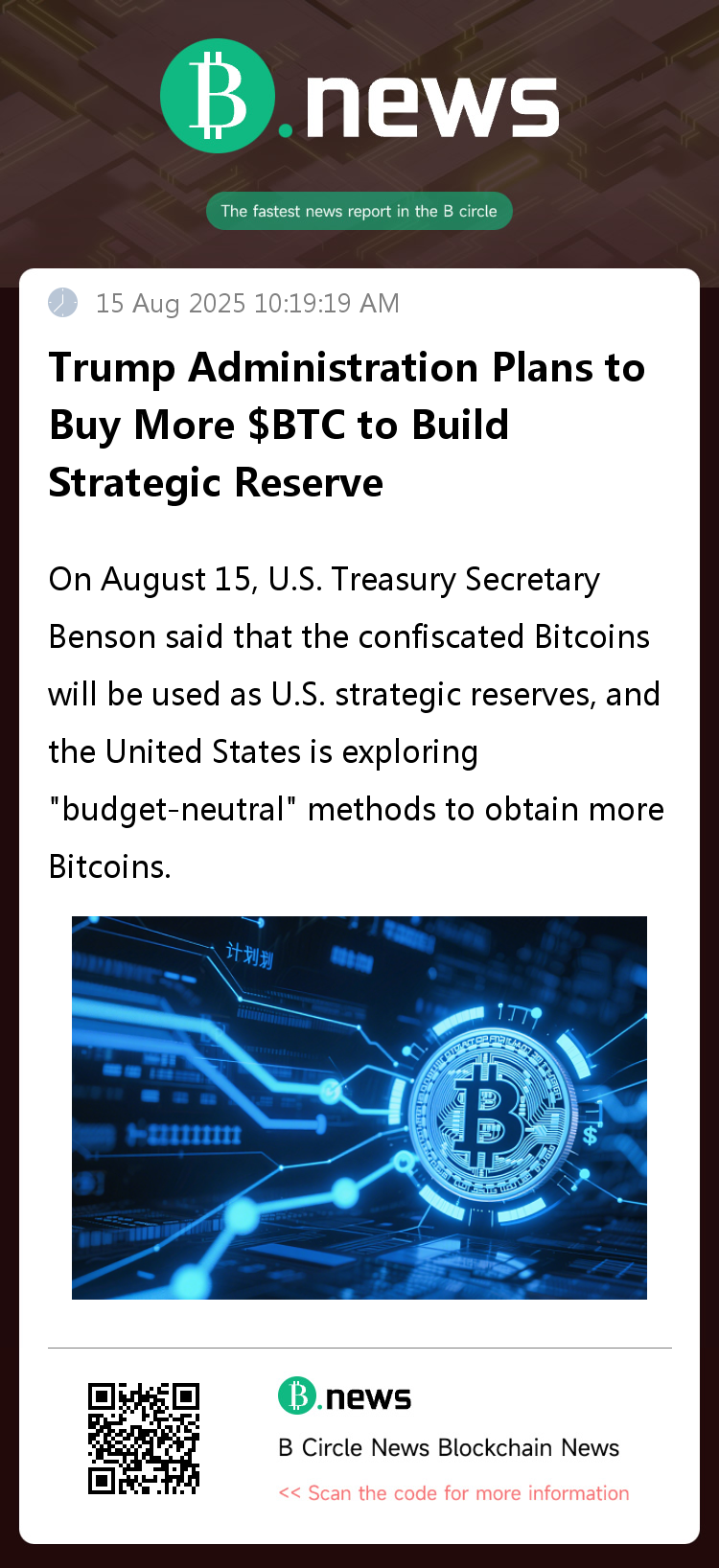 On August 15th, U.S. Treasury Secretary Scott Bessent stated that confiscated Bitcoin would be used as part of the U.S. Strategic Reserve, and that the U.S. is exploring "budget-neutral" methods to acquire more Bitcoin.