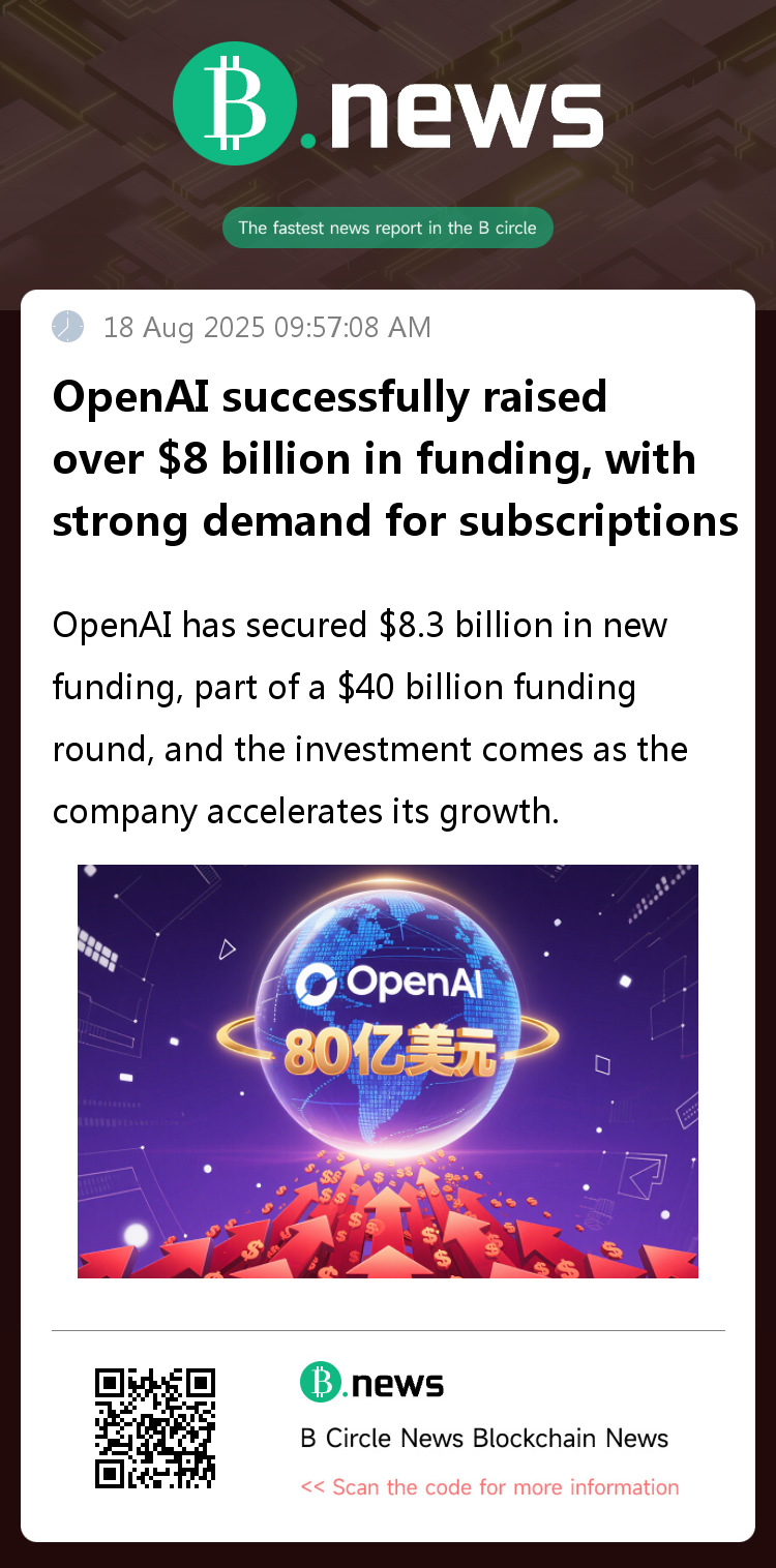 According to Jinshi, a person familiar with the transaction revealed that OpenAI has successfully secured $8.3 billion in a new round of funding, part of a total $40 billion fundraising plan. This financing comes as the company's business accelerates.