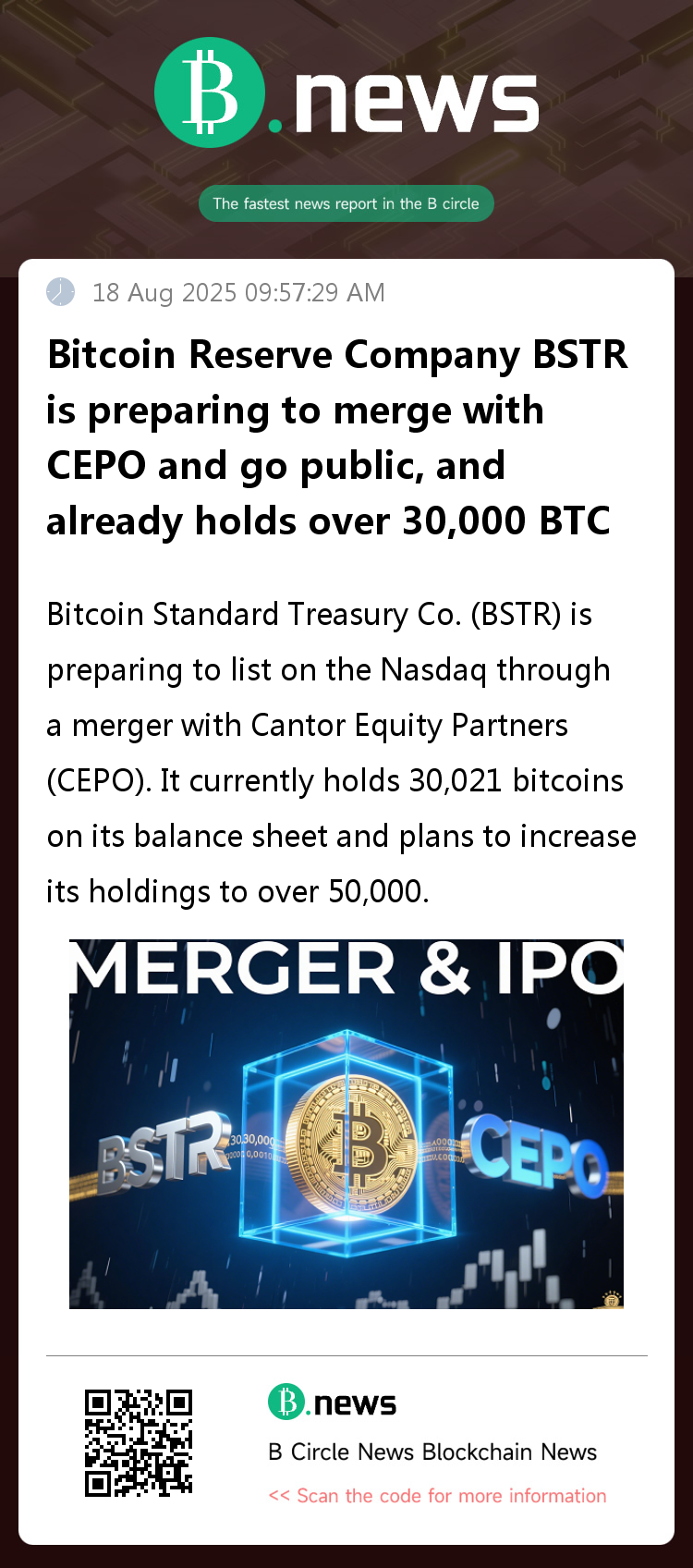 Bitcoin Standard Treasury Co. (BSTR) is preparing to list on the Nasdaq through a merger with Cantor Equity Partners (CEPO). It currently holds 30,021 bitcoins on its balance sheet and plans to increase its holdings to over 50,000.