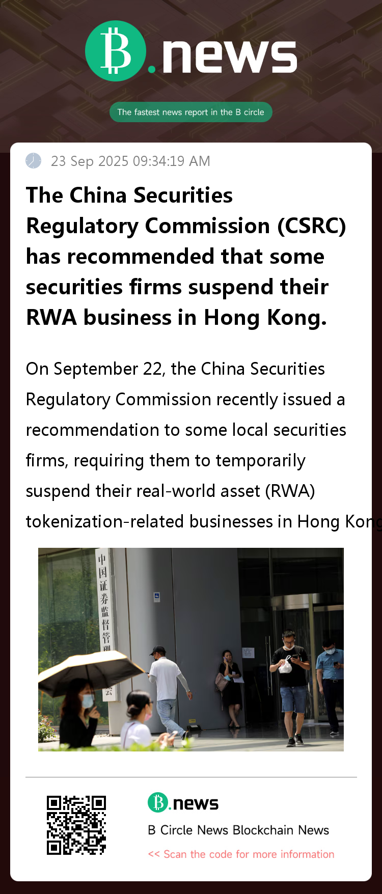 On September 22, sources familiar with the matter revealed that the China Securities Regulatory Commission (CSRC) recently issued a recommendation to some domestic securities firms, requesting them to temporarily suspend their real-world asset (RWA) tokenization business in Hong Kong.