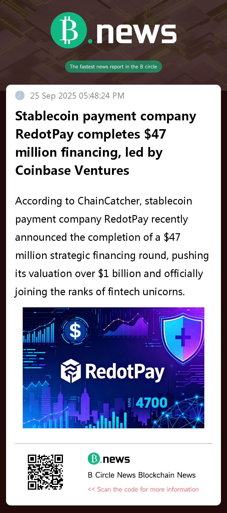 According to ChainCatcher, stablecoin payment company RedotPay recently announced the completion of a $47 million strategic financing round, pushing its valuation over $1 billion and officially joining the ranks of fintech unicorns.