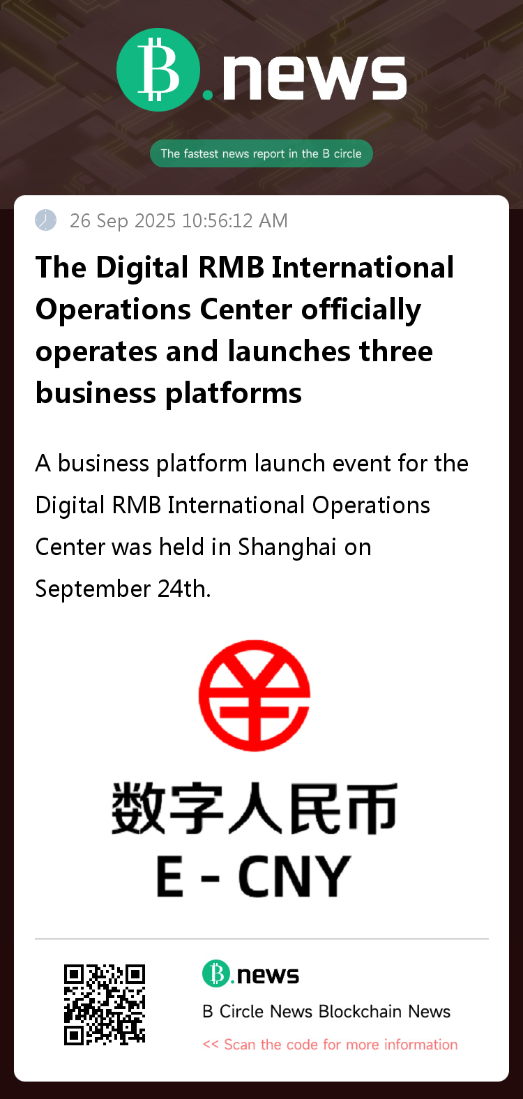 A business platform launch event for the Digital RMB International Operations Center was held in Shanghai on September 24th. The event focused on promoting the functions of the Digital RMB cross-border digital payment platform, Digital RMB blockchain service platform, and digital asset platform to relevant institutions, marking the official operation of the Digital RMB International Operations Center.