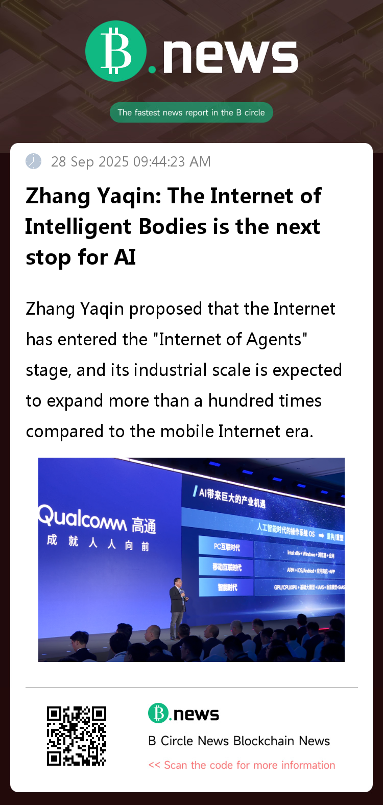 Zhang Yaqin proposed that the internet has entered the "Internet of Agents" stage, with its industrial scale expected to expand more than a hundredfold compared to the mobile internet era.