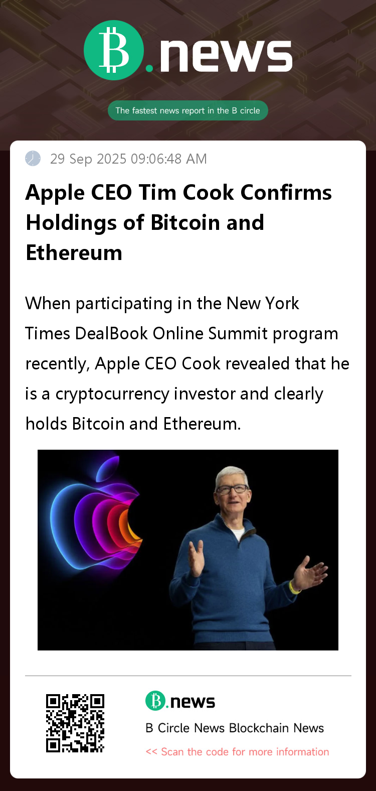 During a recent appearance on the New York Times' DealBook Online Summit, Apple CEO Tim Cook revealed that he is a cryptocurrency investor and holds Bitcoin and Ethereum.
