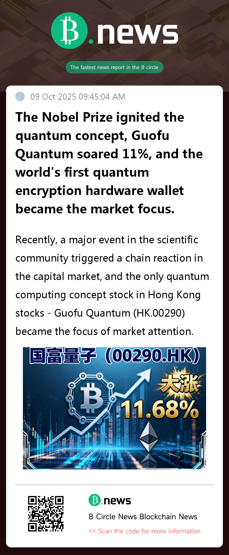 The Nobel Prize recognition has given the entire quantum technology industry a boost. Guofu Quantum's market performance is closely tied to its substantial breakthroughs in the quantum encryption hardware segment. When blockchain technology meets quantum security, a race has quietly begun to determine the future security of digital assets. Whether Guofu Quantum can leverage its technological first-mover advantage to dominate the new quantum security arena will warrant continued market attention.