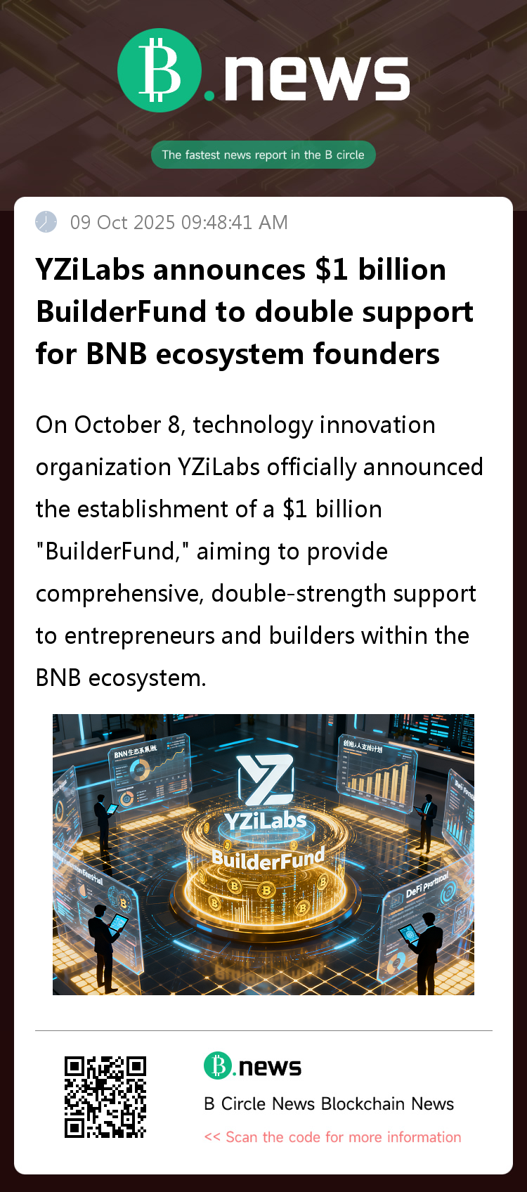 On October 8 (UTC 8), technology innovation organization YZiLabs officially announced the establishment of a $1 billion "BuilderFund," aiming to provide comprehensive, double-strength support to entrepreneurs and builders within the BNB ecosystem.