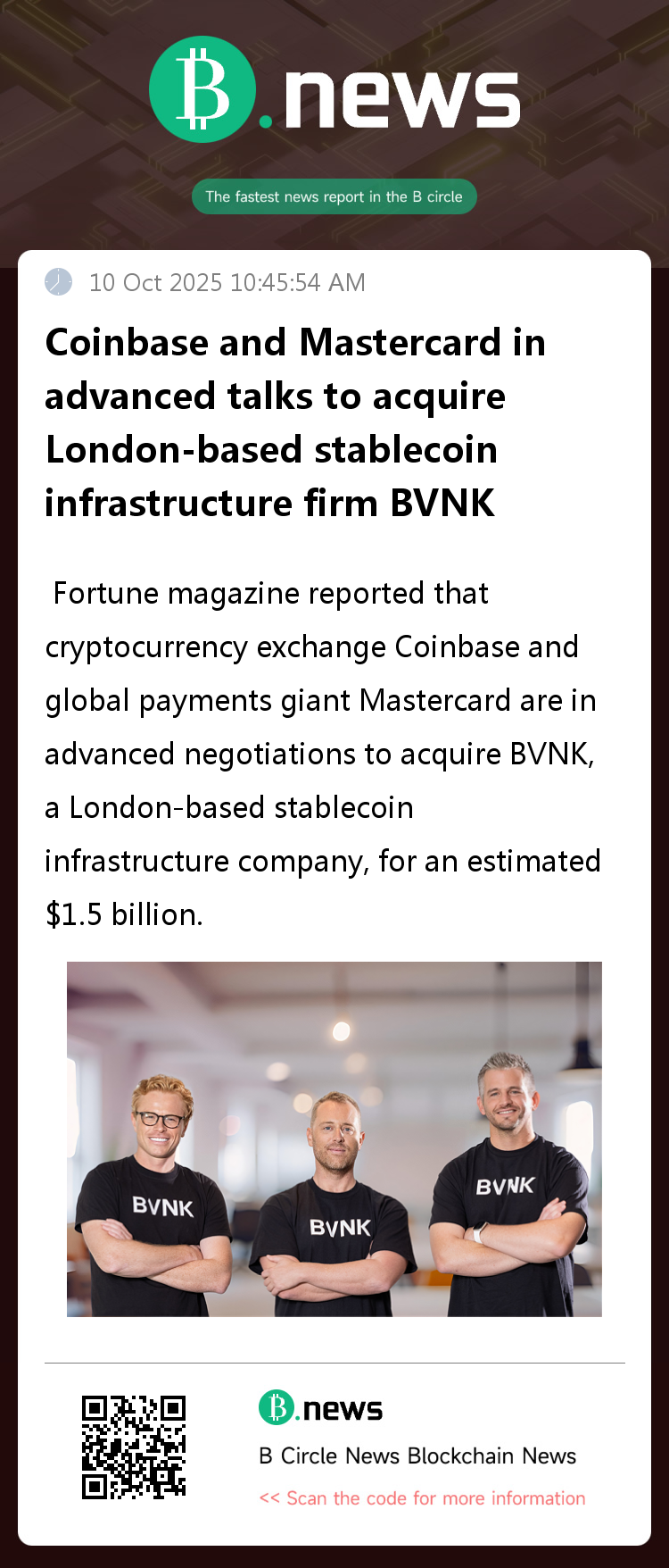 On October 10, Fortune magazine reported that cryptocurrency exchange Coinbase and global payments giant Mastercard are in advanced negotiations to acquire BVNK, a London-based stablecoin infrastructure company, for an estimated $1.5 billion to $2.5 billion.