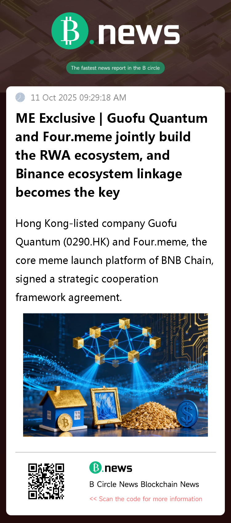 Recently, Hong Kong-listed company Guofu Quantum (0290.HK) and Four.meme, the core meme launch platform of BNB Chain, signed a strategic cooperation framework agreement. The two parties will focus on deep collaboration in the RWA field and jointly build an RWA issuance ecosystem.