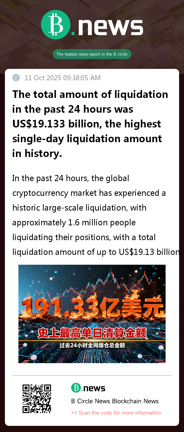 On October 11th (UTC+8), according to Coinglass data, the global cryptocurrency market experienced a historic surge in liquidations over the past 24 hours, with approximately 1.6 million accounts liquidated, totaling $19.13 billion, setting a record for the highest single-day liquidation ever.