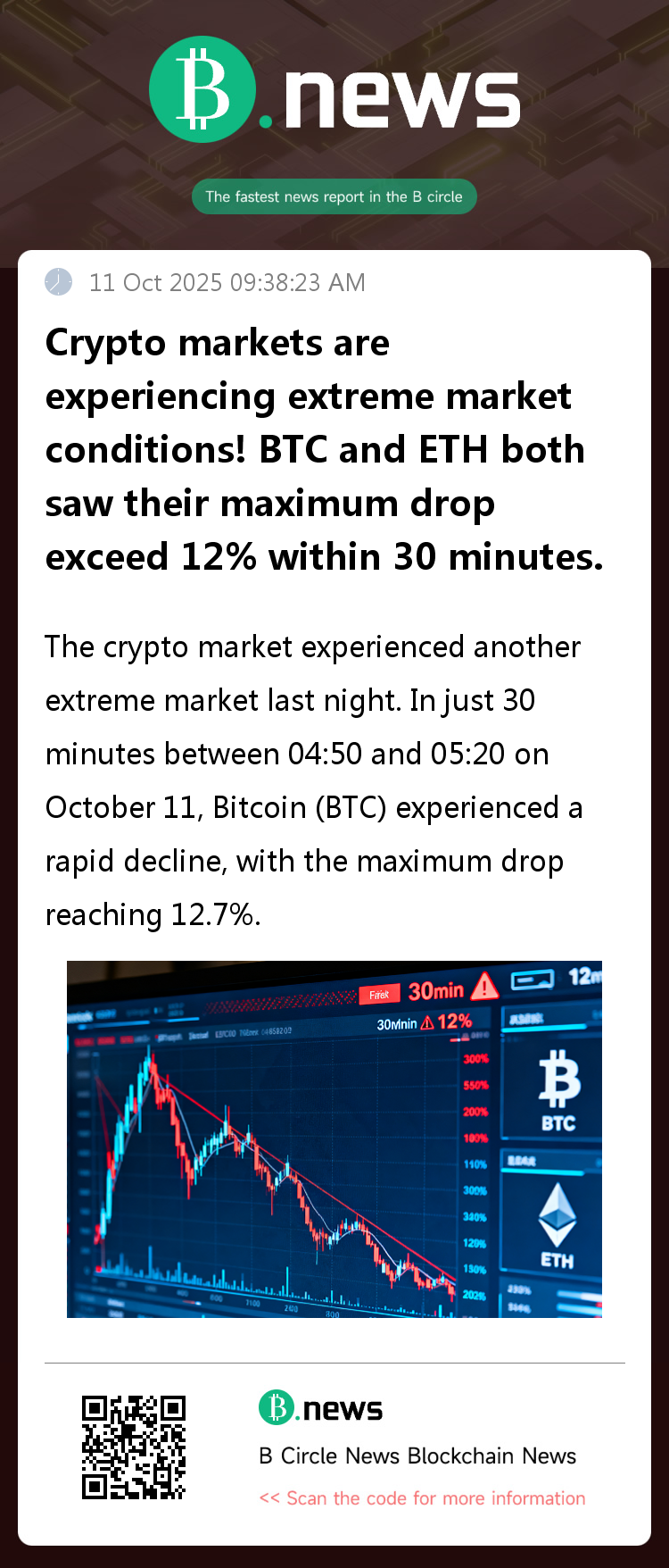 The crypto market experienced another period of extreme volatility last night. In just thirty minutes, between 04:50 and 05:20 on October 11th, Bitcoin (BTC) plummeted, dropping as much as 12.7% to a low of $102,000.00. Ethereum (ETH) also fell, plummeting as much as 14.3% in the space of half an hour to a low of $3,435.00, a more drastic decline than Bitcoin.