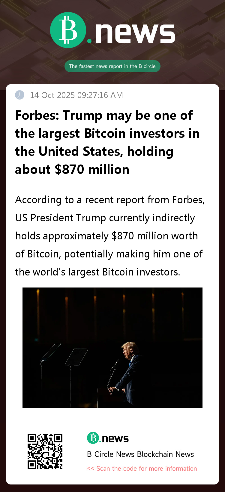 According to a recent report from Forbes, US President Trump currently indirectly holds approximately $870 million worth of Bitcoin, potentially making him one of the world's largest Bitcoin investors.