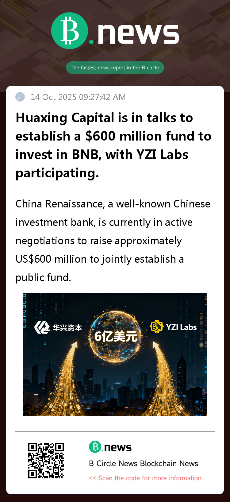 It is reported that China Renaissance will co-invest in the fund with YZiLabs, with the latter planning to invest $200 million. Huaxing, according to documents filed in August of this year, has initially planned to invest approximately $100 million in BNB assets.