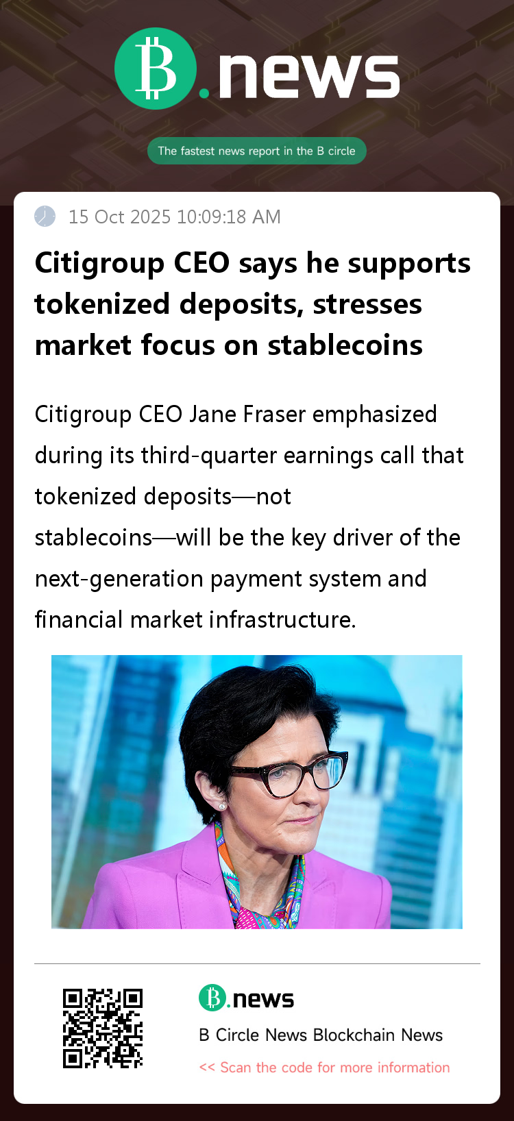According to CoinDesk, Citigroup CEO Jane Fraser emphasized during its third-quarter earnings call that tokenized deposits—not stablecoins—will be the key driver of the next-generation payment system and financial market infrastructure.