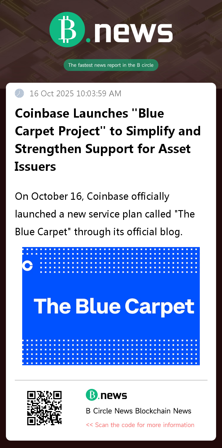 On October 16th, Coinbase officially launched a new service offering, "The Blue Carpet," through its official blog. This comprehensive suite of products and services covers the entire asset issuance lifecycle, aiming to provide more efficient and systematic support to all asset issuers, from the initial application stage to successful listing and subsequent operational management, ensuring seamless integration throughout the entire process.