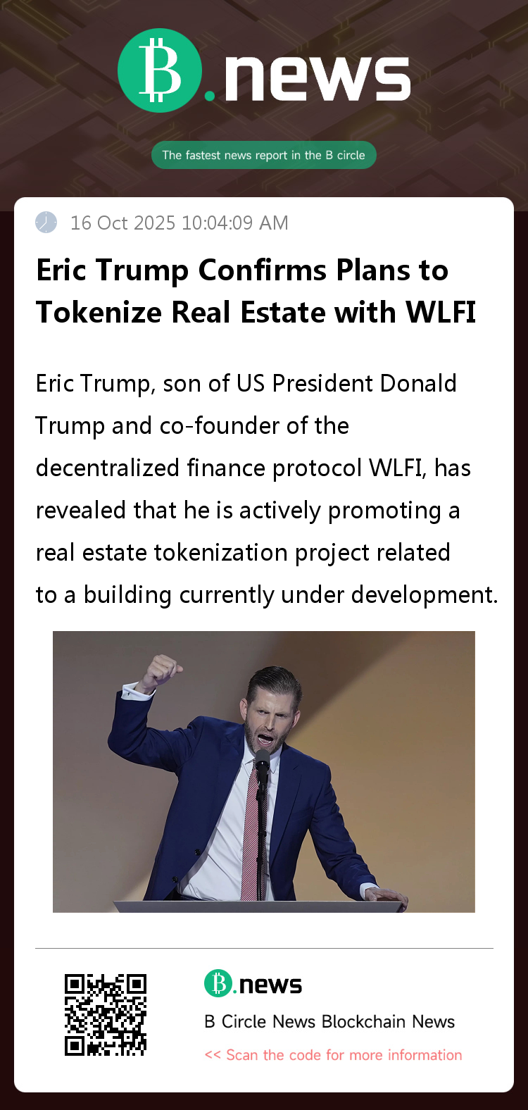 According to a CoinDesk report on October 16, Eric Trump, son of US President Donald Trump and co-founder of the decentralized finance protocol WLFI, revealed that he is actively promoting a real estate tokenization project related to a building currently under development.