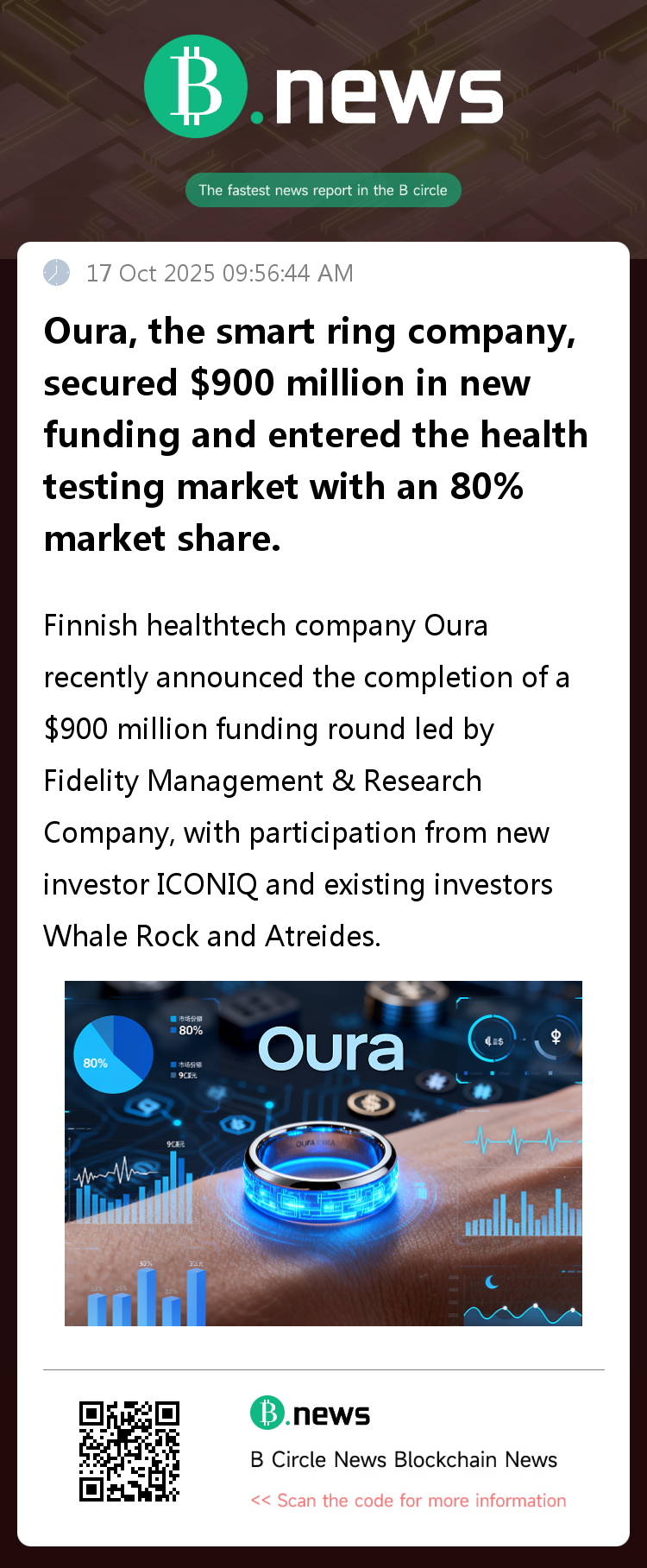 Finnish healthtech company Oura recently announced the completion of a $900 million funding round led by Fidelity Management & Research Company, with participation from new investor ICONIQ and existing investors Whale Rock and Atreides.