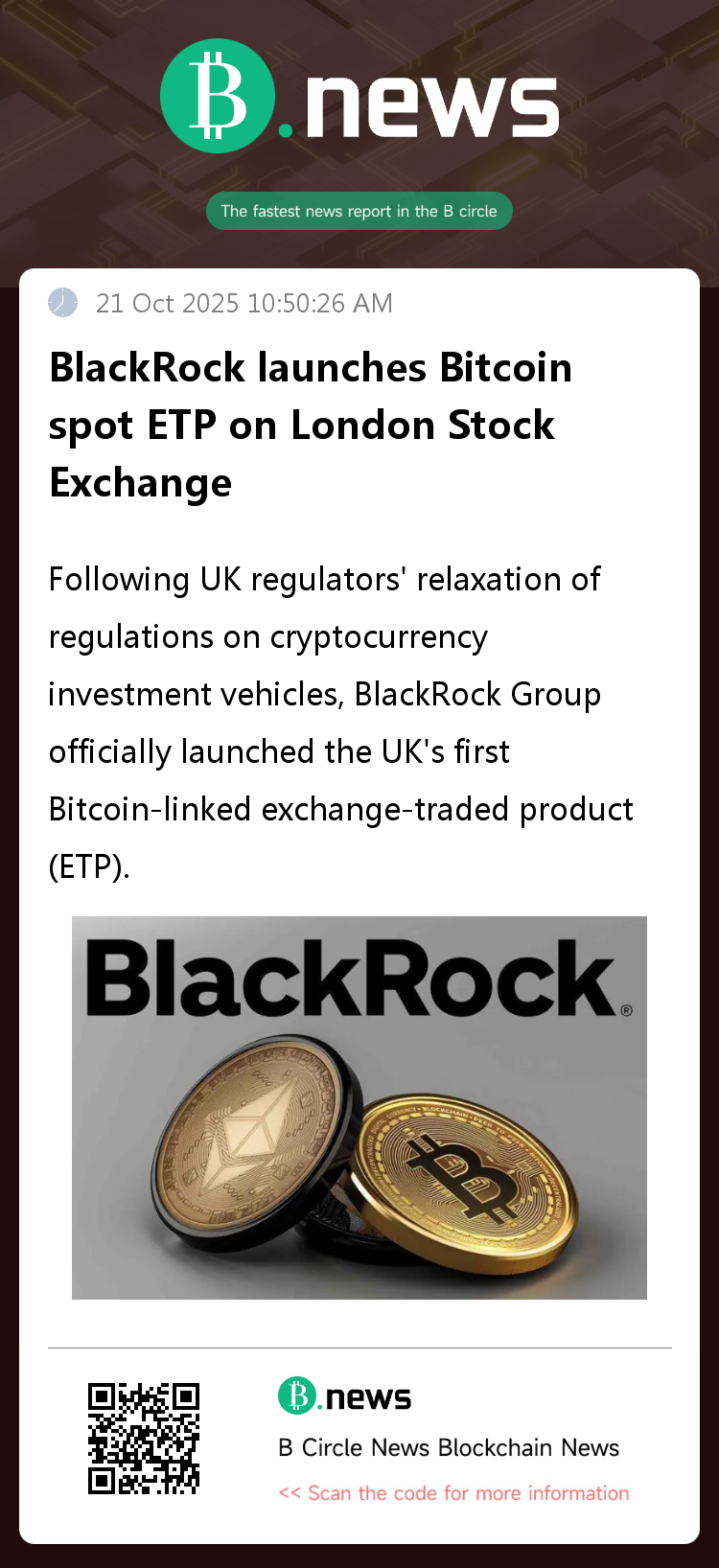 Following UK regulators' relaxation of regulations on cryptocurrency investment vehicles, BlackRock Group officially launched the UK's first Bitcoin-linked exchange-traded product (ETP).