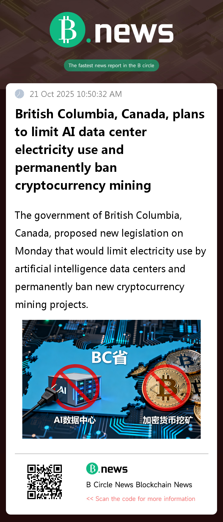 On October 21st, Bloomberg reported that the British Columbia (BC) government proposed new legislation on Monday that would restrict electricity use by artificial intelligence (AI) data centers and permanently ban new cryptocurrency mining projects.