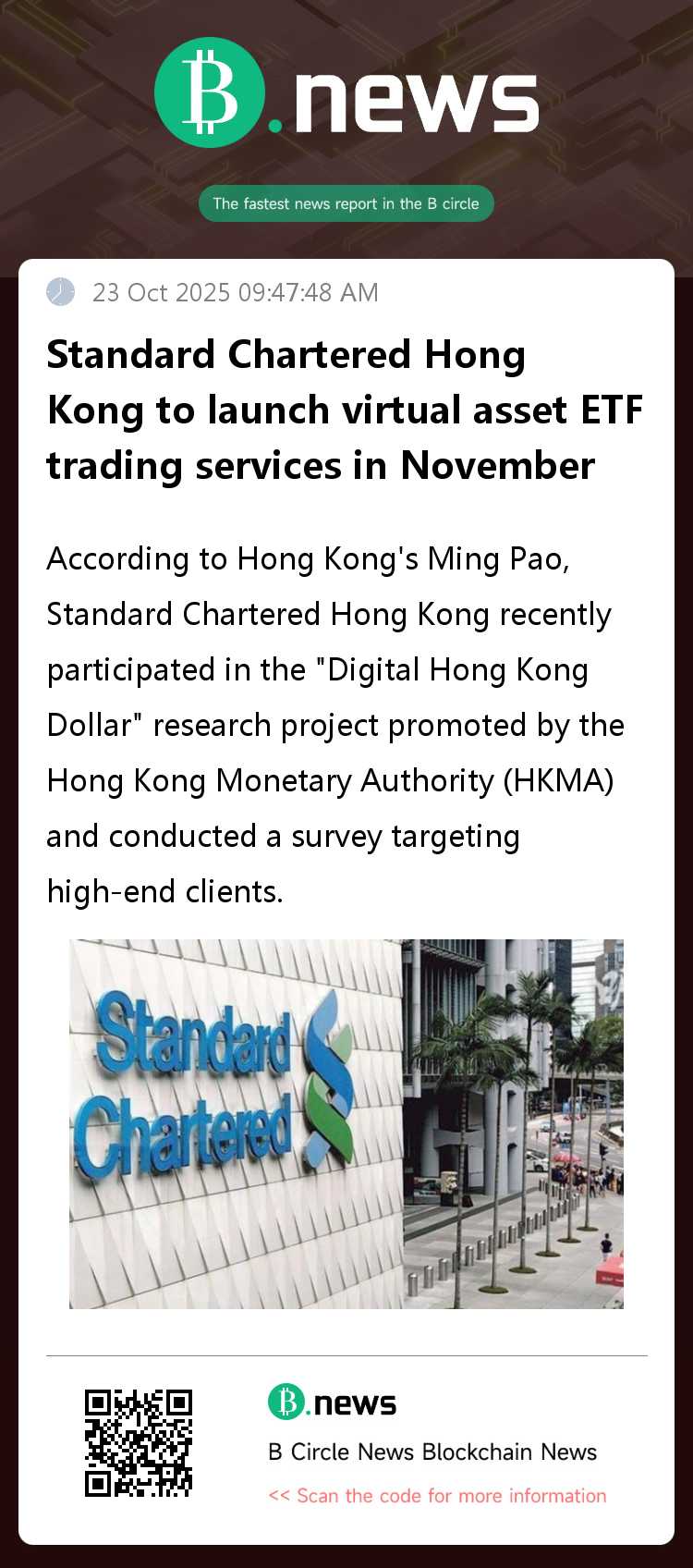 In an interview, Ho Man-chun, Head of Wealth Solutions at Standard Chartered Hong Kong, further stated that in response to growing client demand for digital assets, the bank will officially launch trading services for virtual asset exchange-traded funds (ETFs) in November of this year.