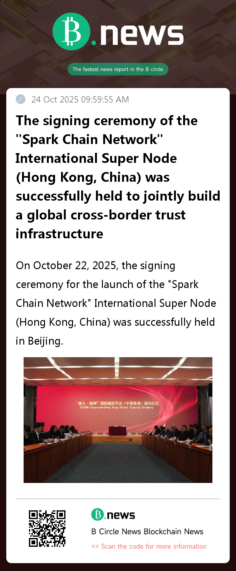 On October 22, 2025, the signing ceremony for the launch of the "Spark Chain Network" International Super Node (Hong Kong, China) was successfully held in Beijing.