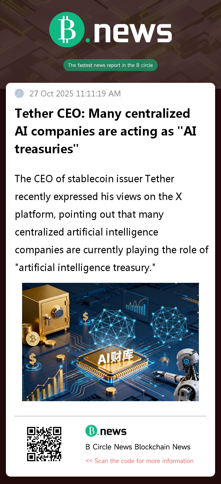 Paolo Ardoino, CEO of stablecoin issuer Tether, recently expressed his views on the X platform, noting that many centralized AI companies are currently acting as "AI treasuries," centrally controlling vast amounts of data, computing power, and model resources.