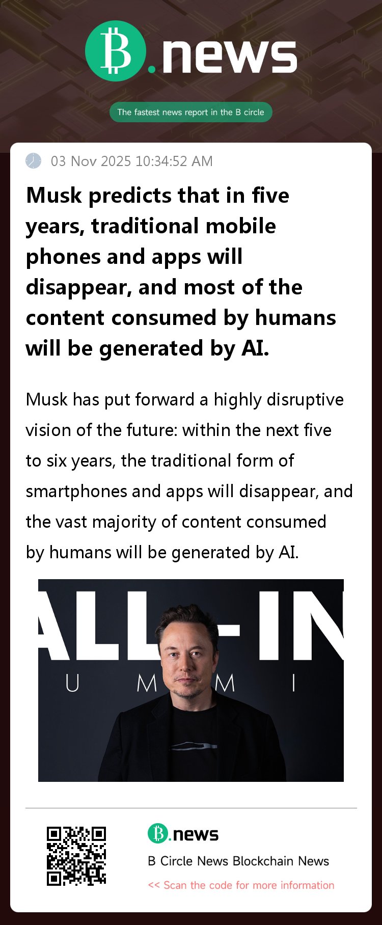 In a podcast, Tesla CEO Elon Musk once again demonstrated his forward-looking vision of technological evolution, proposing a highly disruptive future: within the next five to six years, the traditional form of smartphones and applications will completely disappear, and the vast majority of content consumed by humans will be generated by artificial intelligence. Musk pointed out that future devices will no longer rely on the "operating system" we are familiar with, nor will there be the concept of "applications." He described it as: "Your phone is essentially just an interface that presents images and sounds;