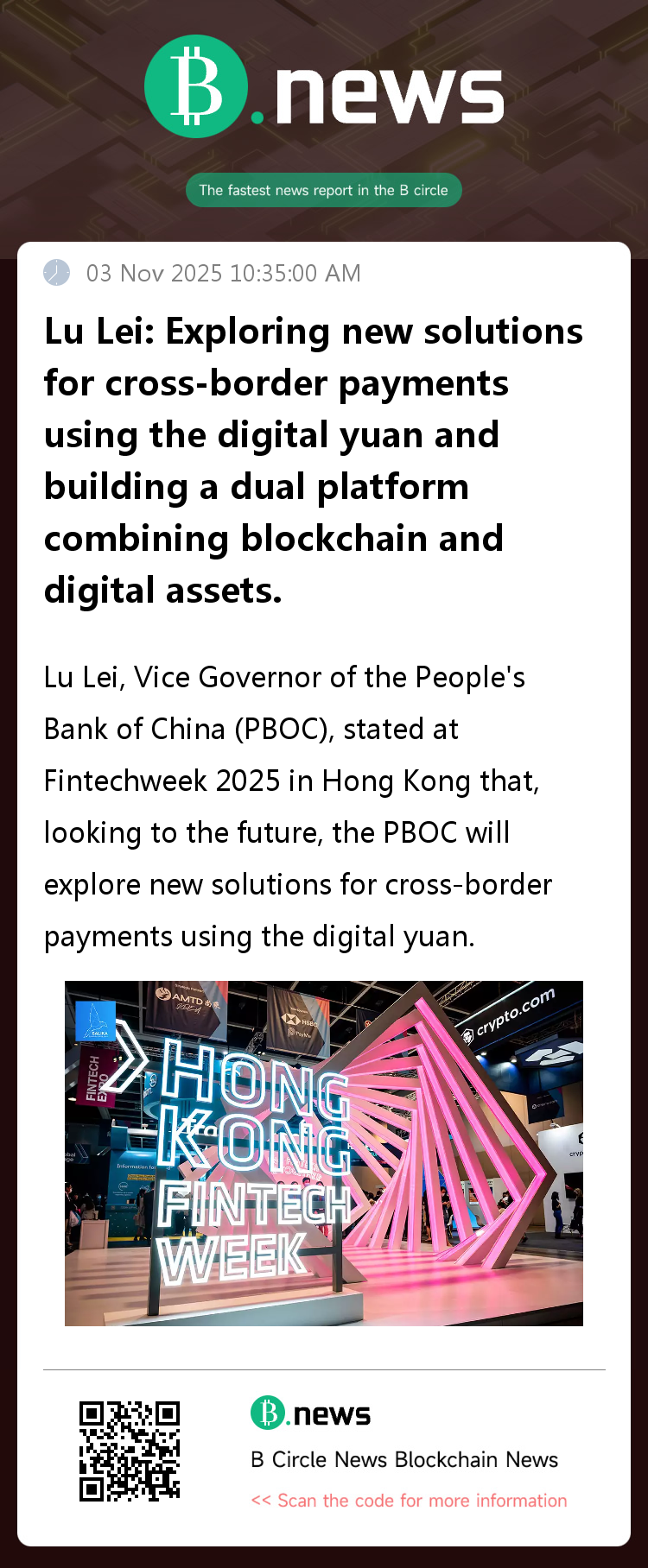On November 3, Lu Lei, Vice Governor of the People's Bank of China (PBOC), stated at Fintechweek 2025 in Hong Kong that, looking to the future, the PBOC will explore new solutions for cross-border payments using the digital yuan.