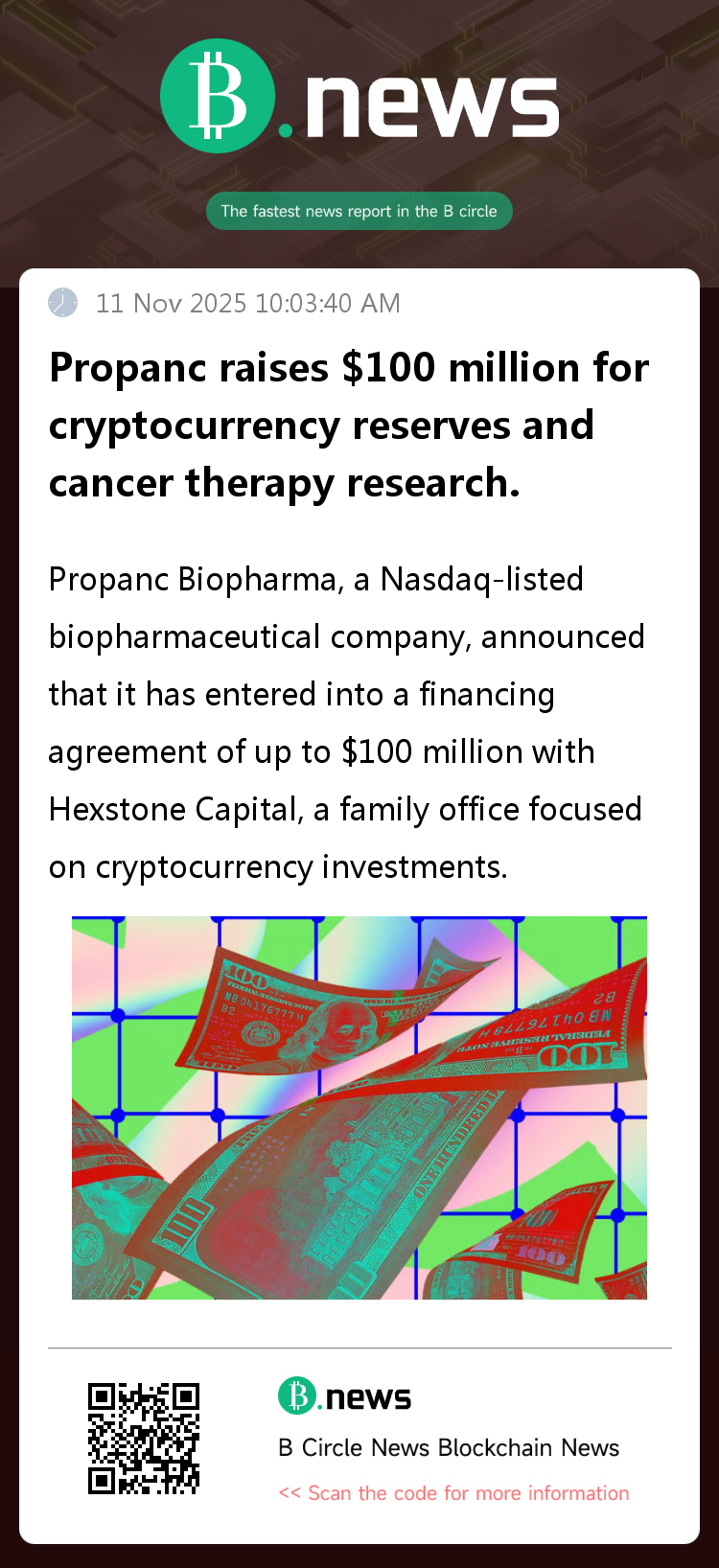On November 11th, according to The Block, Nasdaq-listed biopharmaceutical company Propanc Biopharma (ticker symbol: PPCB) announced a funding agreement of up to $100 million with Hexstone Capital, a family office focused on cryptocurrency investments.