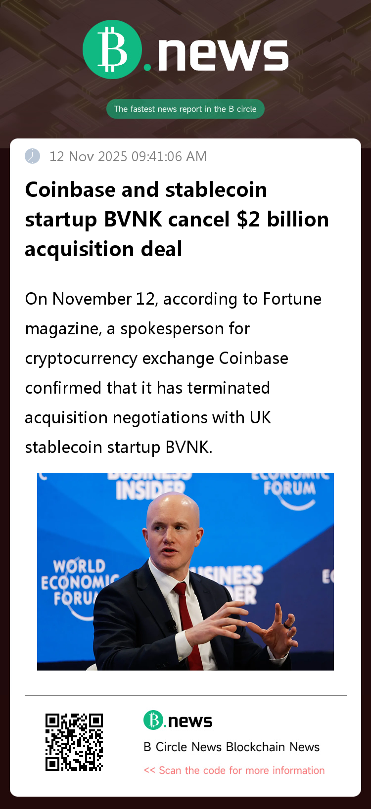 On November 12, according to Fortune magazine, a spokesperson for cryptocurrency exchange Coinbase confirmed that it has terminated acquisition negotiations with UK stablecoin startup BVNK.