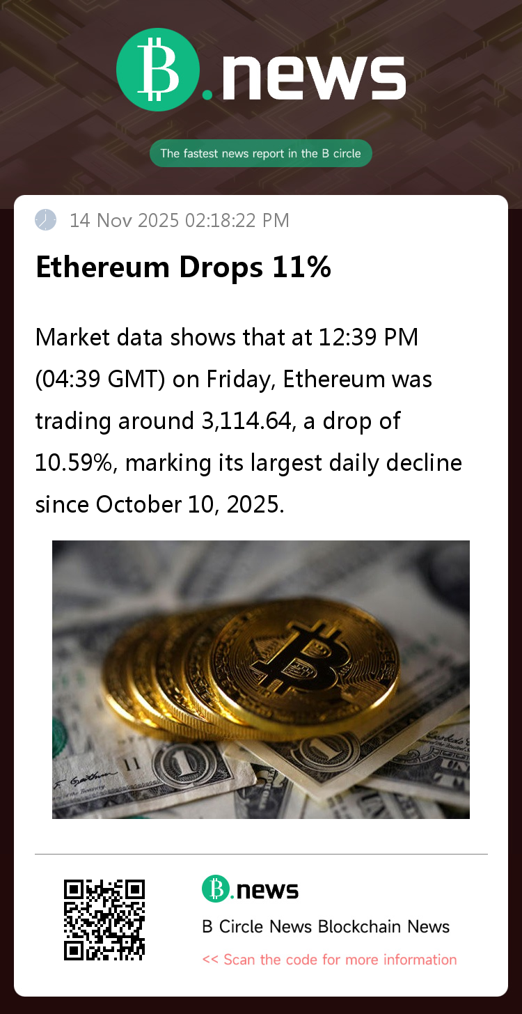 Market data shows that at 12:39 PM (04:39 GMT) on Friday, Ethereum was trading around 3,114.64, a drop of 10.59%, marking its largest daily decline since October 10, 2025.