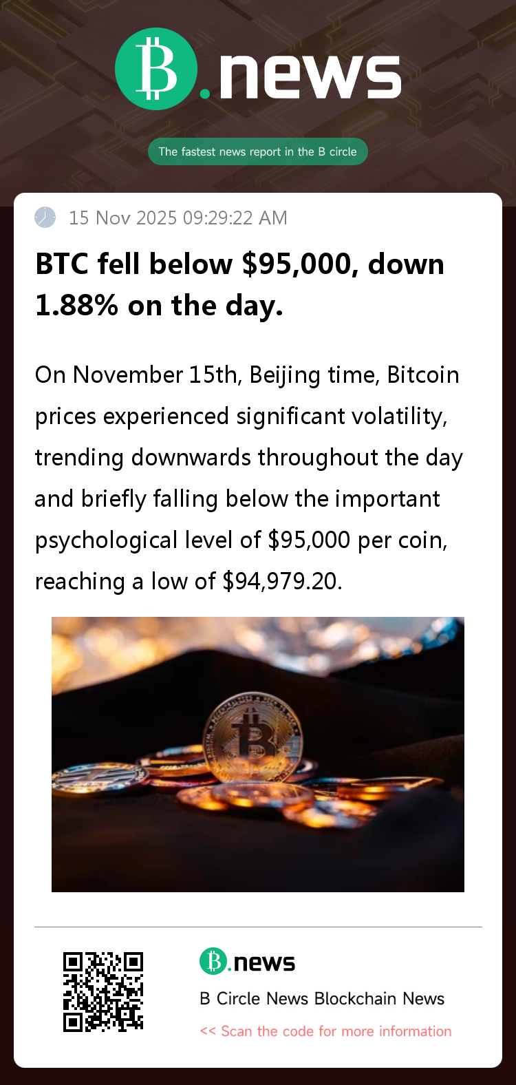 According to data from the OKX trading platform, Bitcoin experienced significant volatility on November 15th (Beijing time), with prices trending downwards and briefly falling below the key psychological and technical level of $95,000 per coin, reaching a low of $94,979.20. As of press time, the daily decline was 1.88%.