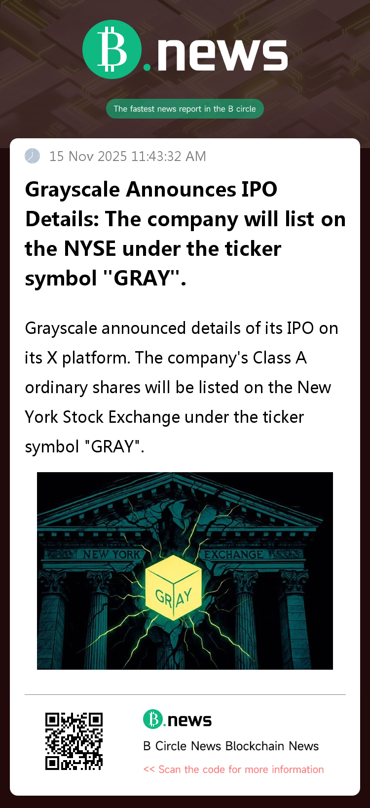 Grayscale announced details of its IPO on its X platform. The company's Class A ordinary shares will be listed on the New York Stock Exchange under the ticker symbol "GRAY". Morgan Stanley, Bank of America Securities, Jefferies, and Cantor will serve as the lead underwriters for the IPO, while Wells Fargo, Canaccord Genuity, Piper Sandler, Keefe, Bruyette & Woods, and Needham & Company will also participate in the underwriting.