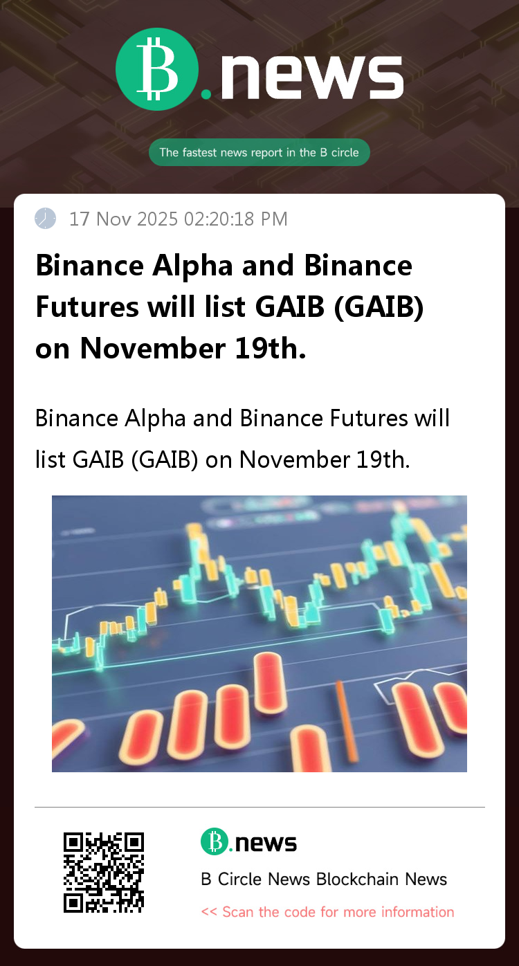 On November 17th, according to an official announcement, Binance Alpha and Binance Futures will launch GAIB (GAIB) on November 19th. Eligible users can claim airdrops using Binance Alpha Points on the Alpha event page after Alpha trading opens. Further details will be announced separately.
