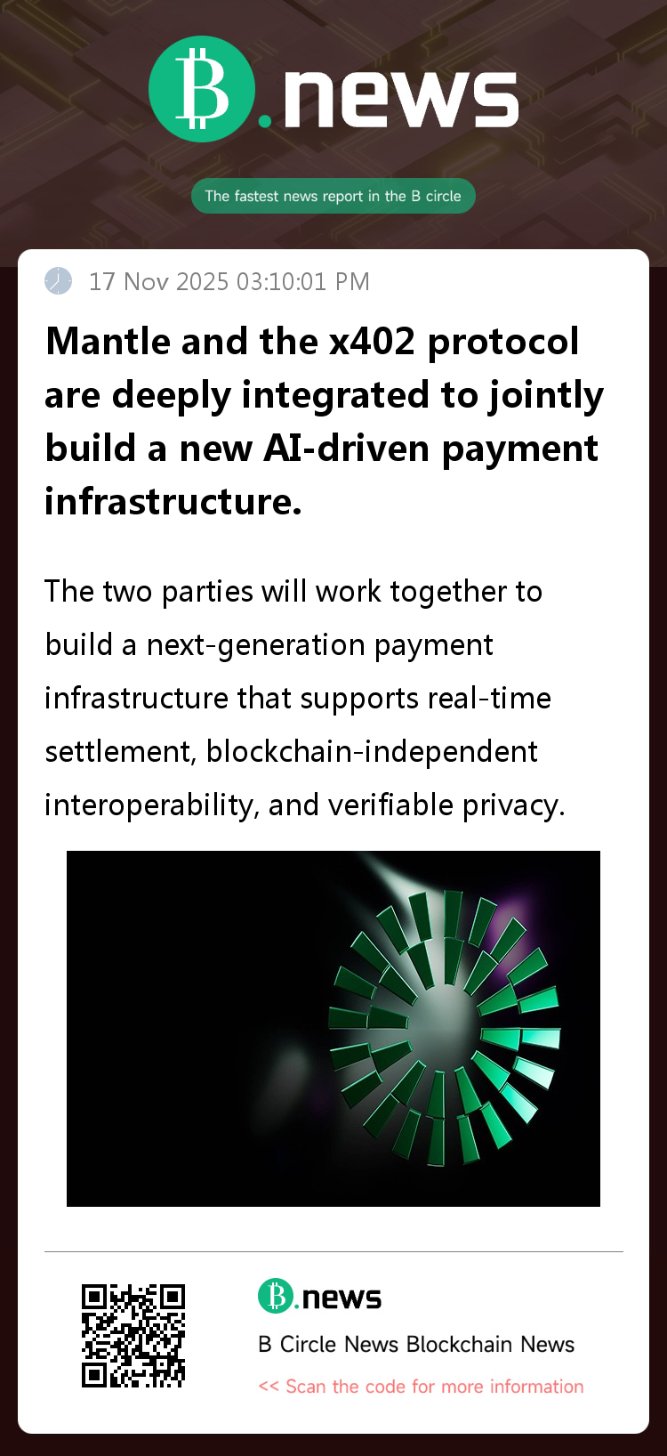 By combining x402's native payment protocol with Mantle's high-performance modular Layer 2 architecture, the two companies will jointly create a next-generation payment infrastructure that supports real-time settlement, chain-agnostic interoperability, and verifiable privacy.