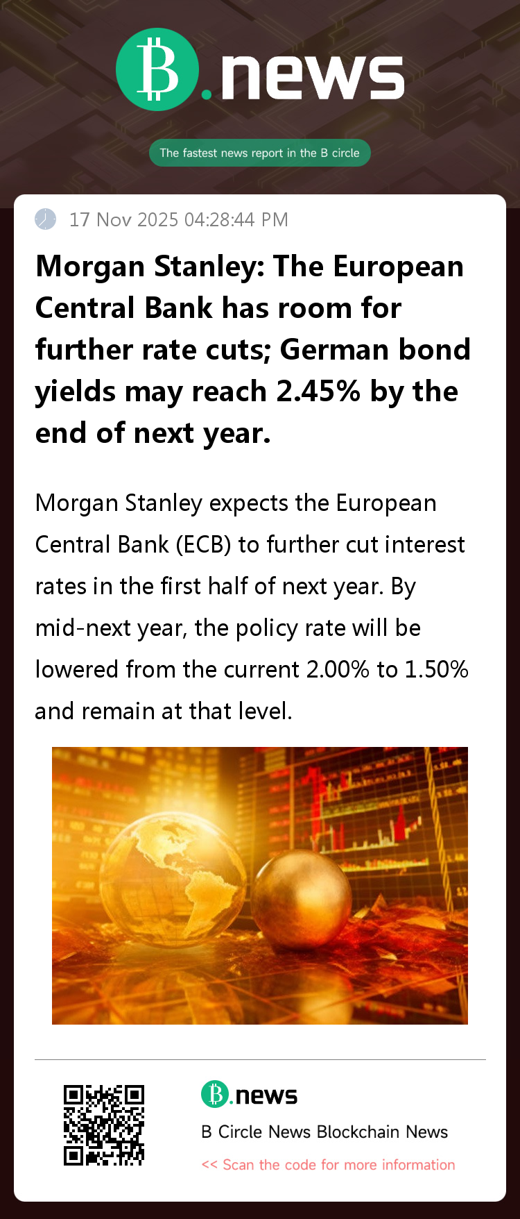 Morgan Stanley expects the European Central Bank (ECB) to further cut interest rates in the first half of next year. By mid-next year, the policy rate will be lowered from the current 2.00% to 1.50% and remain at that level. Strategists noted, "Weak economic growth, lower-than-expected inflation, and limited fiscal stimulus are all driving further easing by the ECB." Against this backdrop, Morgan Stanley expects the 10-year German bond yield to be around 2.45% by the end of 2026. According to LSEG data, the money market anticipates the ECB will cut rates by nearly 10 basis points in June 2026.
