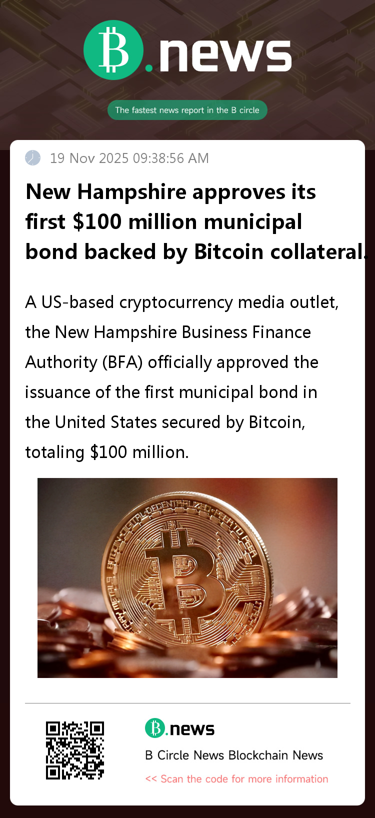 On November 19th, according to Crypto in America, a US-based cryptocurrency media outlet, the New Hampshire Business Finance Authority (BFA) officially approved the issuance of the first municipal bond in the United States secured by Bitcoin, totaling $100 million.