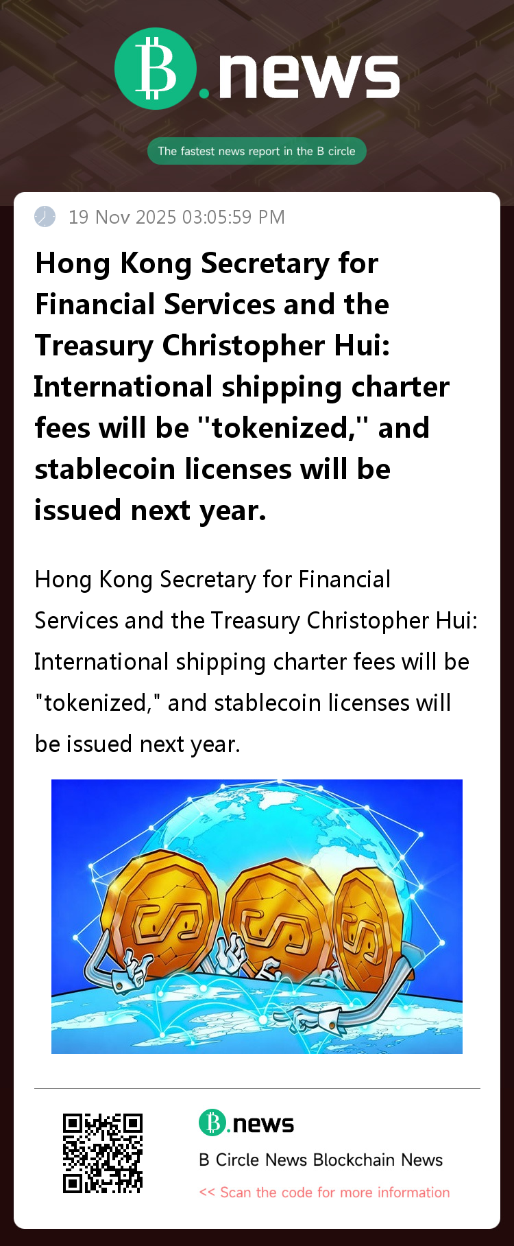 **Hong Kong Financial Secretary Christopher Hui's latest statement clearly outlines Hong Kong's strategic path in the Web3 finance sector.** By exploring the tokenization of international shipping charter rates, clarifying the role of stablecoins in serving the real economy, and exercising extreme caution in regulation, Hong Kong is accelerating the shift of Web3 from virtual to real, striving to build a safe, transparent, and efficient digital asset ecosystem. The upcoming issuance of stablecoin licenses will inject new vitality into Hong Kong's digital asset market, consolidating its position as an international financial center and digital asset hub.