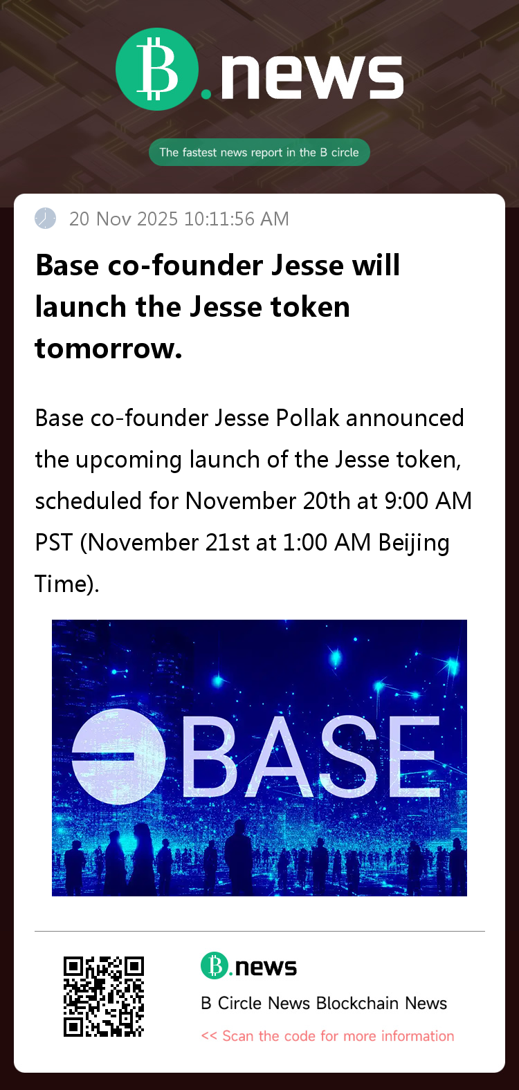 Base co-founder Jesse Pollak announced the upcoming launch of the Jesse token, scheduled for November 20th at 9:00 AM PST (November 21st at 1:00 AM Beijing Time). Jesse specifically warned users to be wary of potential fake accounts, emphasizing that all official updates will only be released through his X account and the Base app.