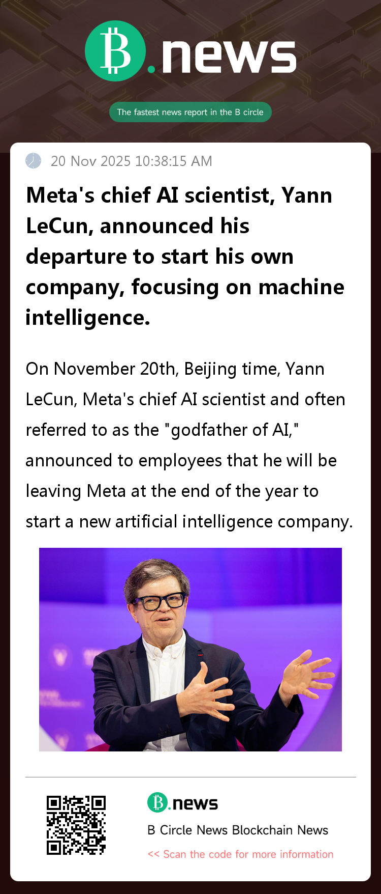 Beijing time, November 20th, Bloomberg reported, citing an internal memo, that Yann LeCun, Meta's chief AI scientist and often referred to as the "godfather of AI," recently announced to employees that he will be leaving Meta at the end of the year to start a new artificial intelligence company.