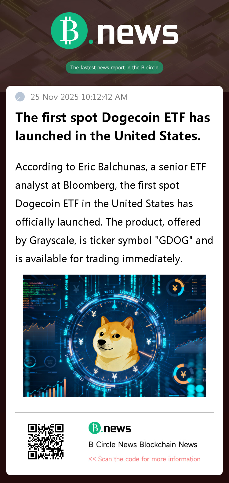 According to Eric Balchunas, a senior ETF analyst at Bloomberg, the first spot Dogecoin ETF in the United States has officially launched. The product, offered by Grayscale, is ticker symbol "GDOG" and is available for trading immediately.