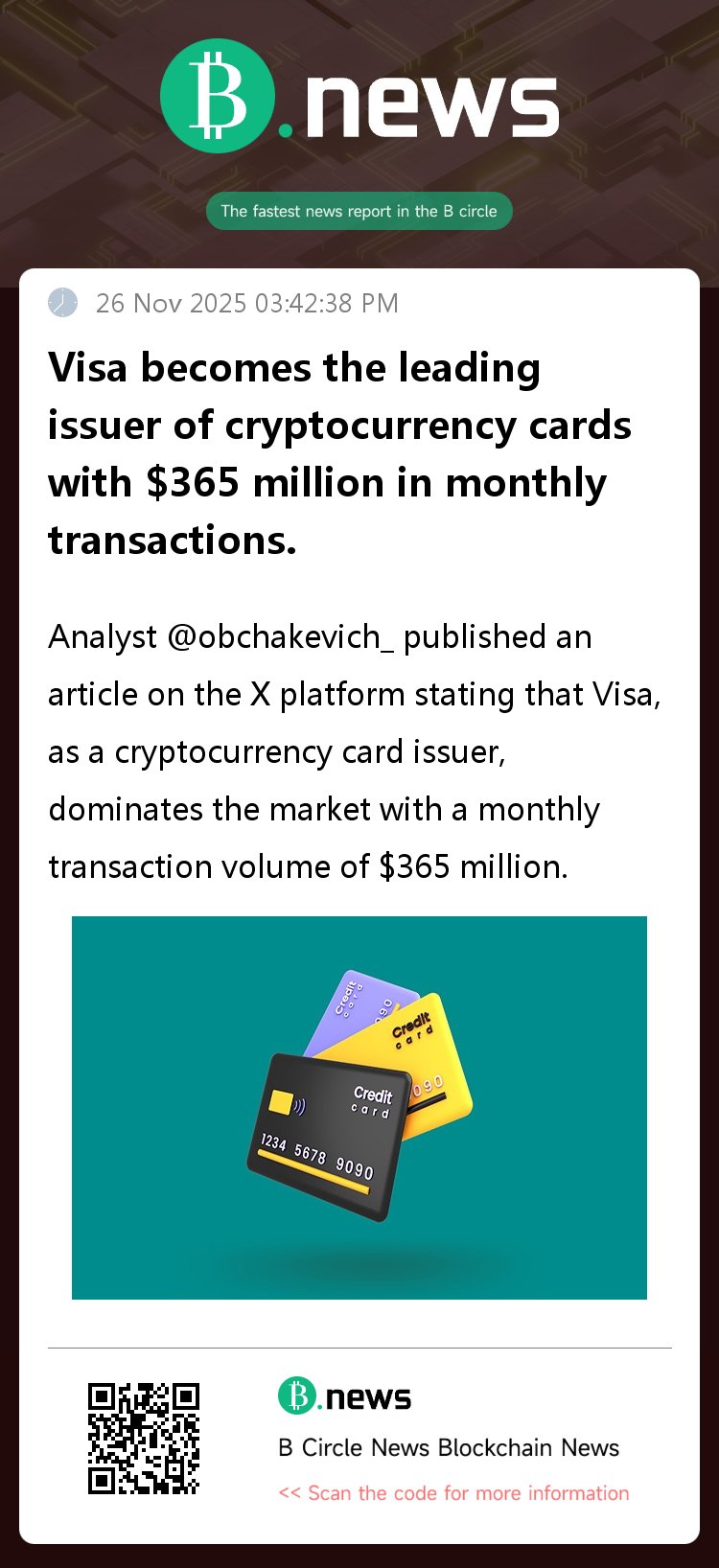 Analyst @obchakevich_ published an article on the X platform stating that Visa, as a cryptocurrency card issuer, dominates the market with a monthly transaction volume of $365 million.