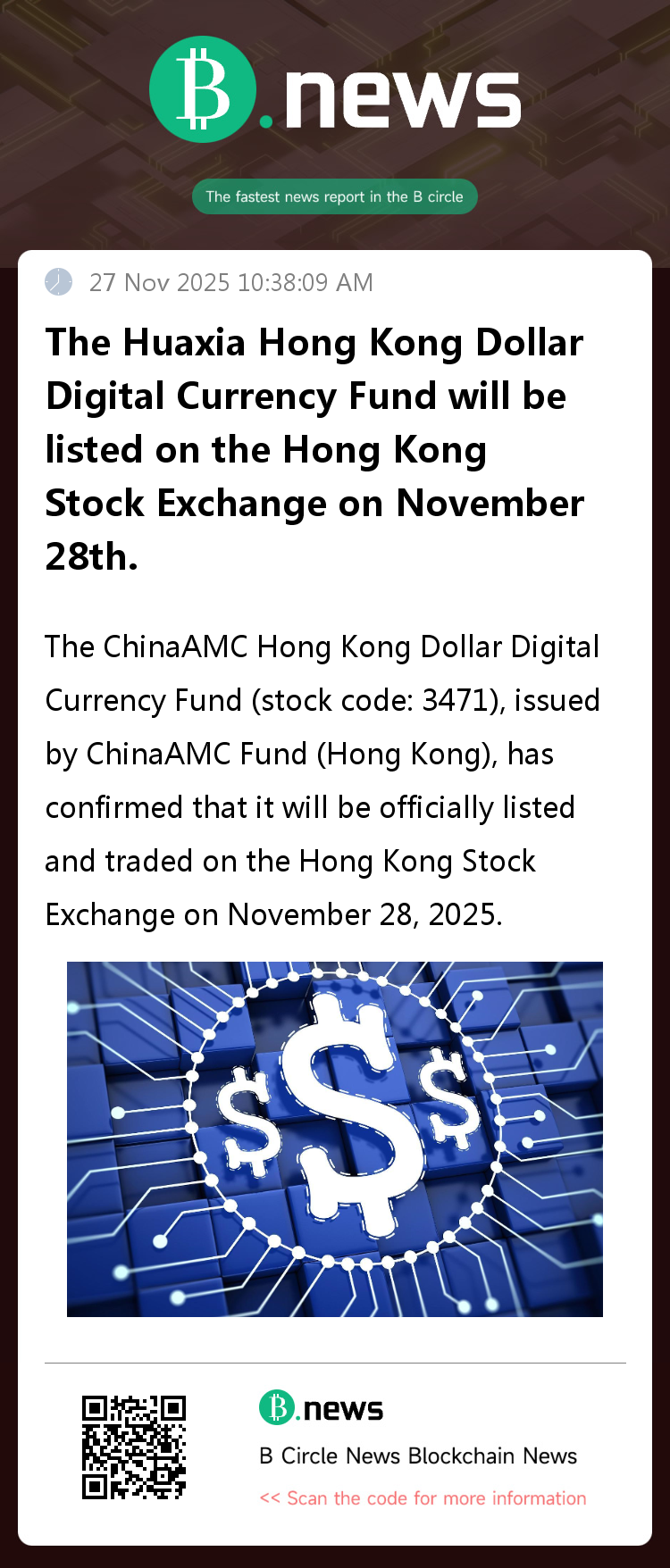 According to the latest announcement from the Hong Kong Stock Exchange, the ChinaAMC Hong Kong Dollar Digital Currency Fund (stock code: 3471), issued by ChinaAMC Fund (Hong Kong), has been confirmed to be officially listed and traded on the Hong Kong Stock Exchange on November 28, 2025.