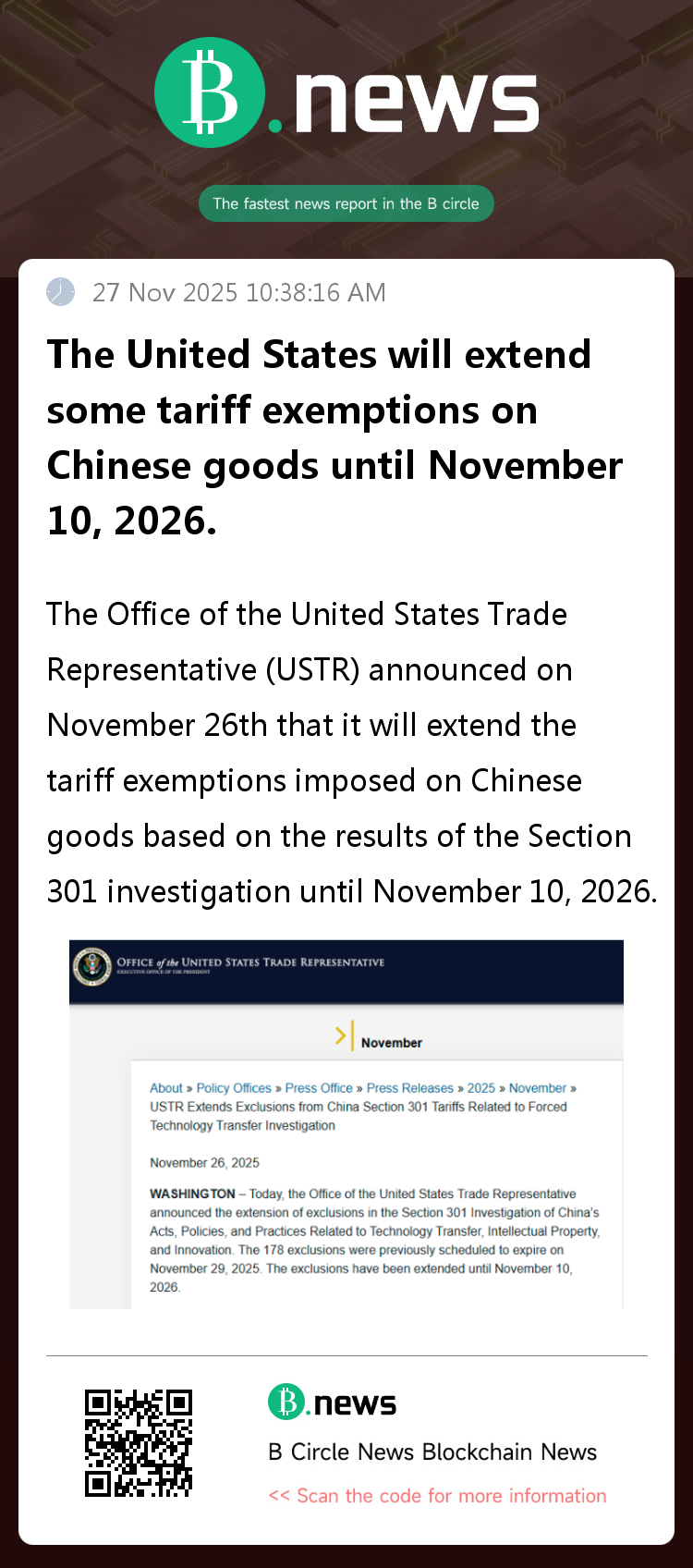 The Office of the United States Trade Representative (USTR) announced on November 26th that it will extend the tariff exemptions imposed on Chinese goods based on the results of the Section 301 investigation until November 10, 2026.