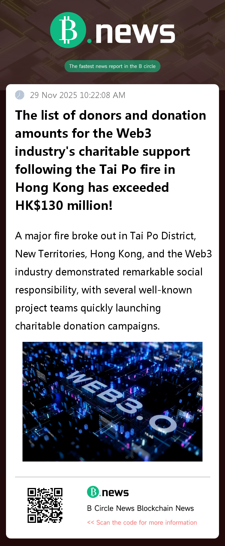 A major fire broke out in Tai Po District, New Territories, Hong Kong, attracting widespread public attention. In the post-disaster relief efforts, the Web3 industry demonstrated remarkable solidarity and social responsibility, with numerous well-known projects, trading platforms, investment institutions, and community members quickly launching charitable donation campaigns.