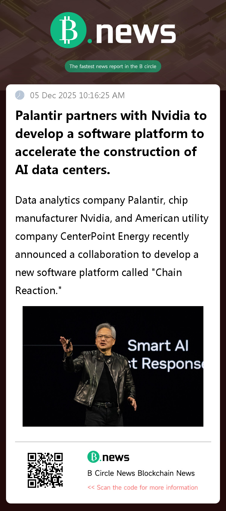 Data analytics company Palantir, chip manufacturer Nvidia, and U.S. utility company CenterPoint Energy recently announced a collaboration to develop a new software platform called "Chain Reaction," aimed at accelerating the construction of next-generation artificial intelligence data centers.