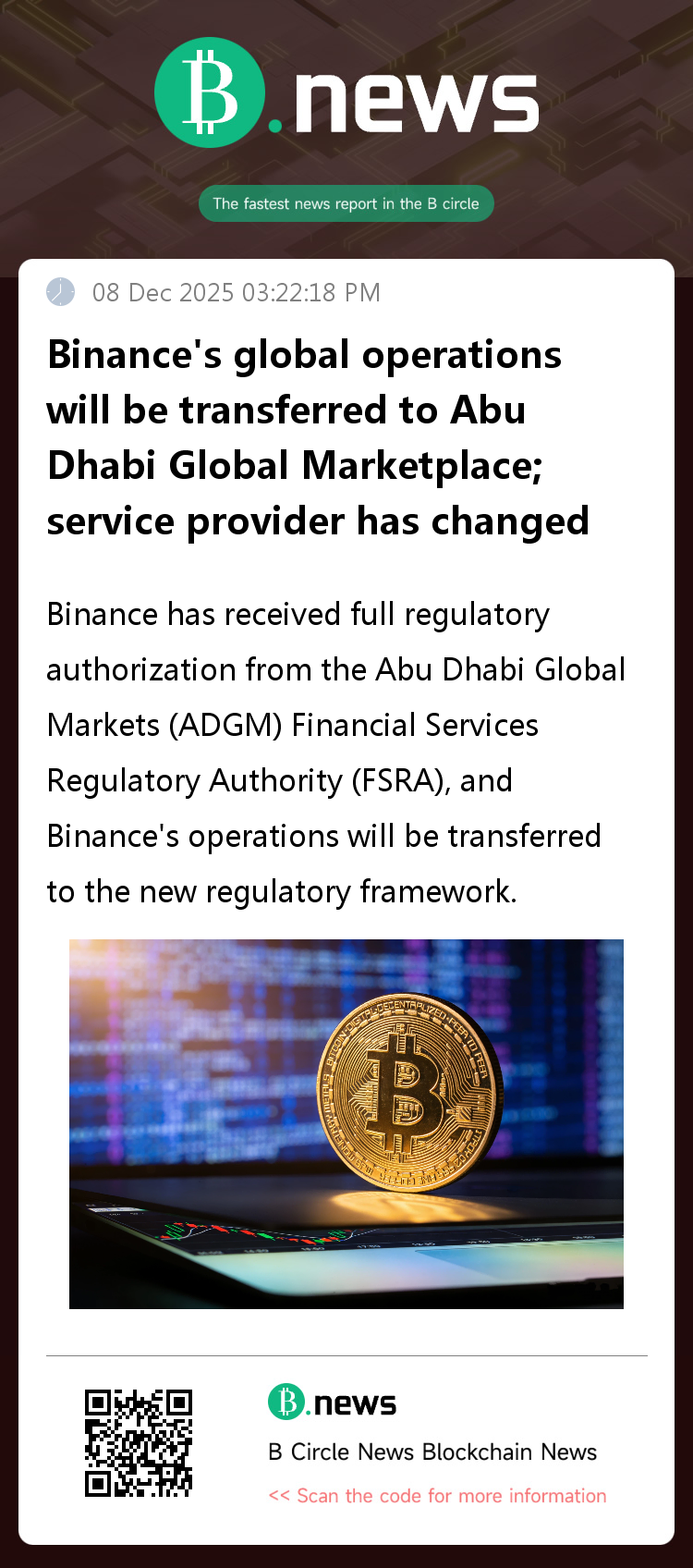 On December 8th, according to an official announcement, Binance has obtained full regulatory authorization from the Abu Dhabi Global Markets (ADGM) Financial Services Regulatory Authority (FSRA). Binance's operations will be transferred to the new regulatory framework. Effective January 5th, 2026, at 16:00 (UTC+8), Binance services will be offered through three ADGM-licensed entities, each playing a specific role according to its regulatory authority: