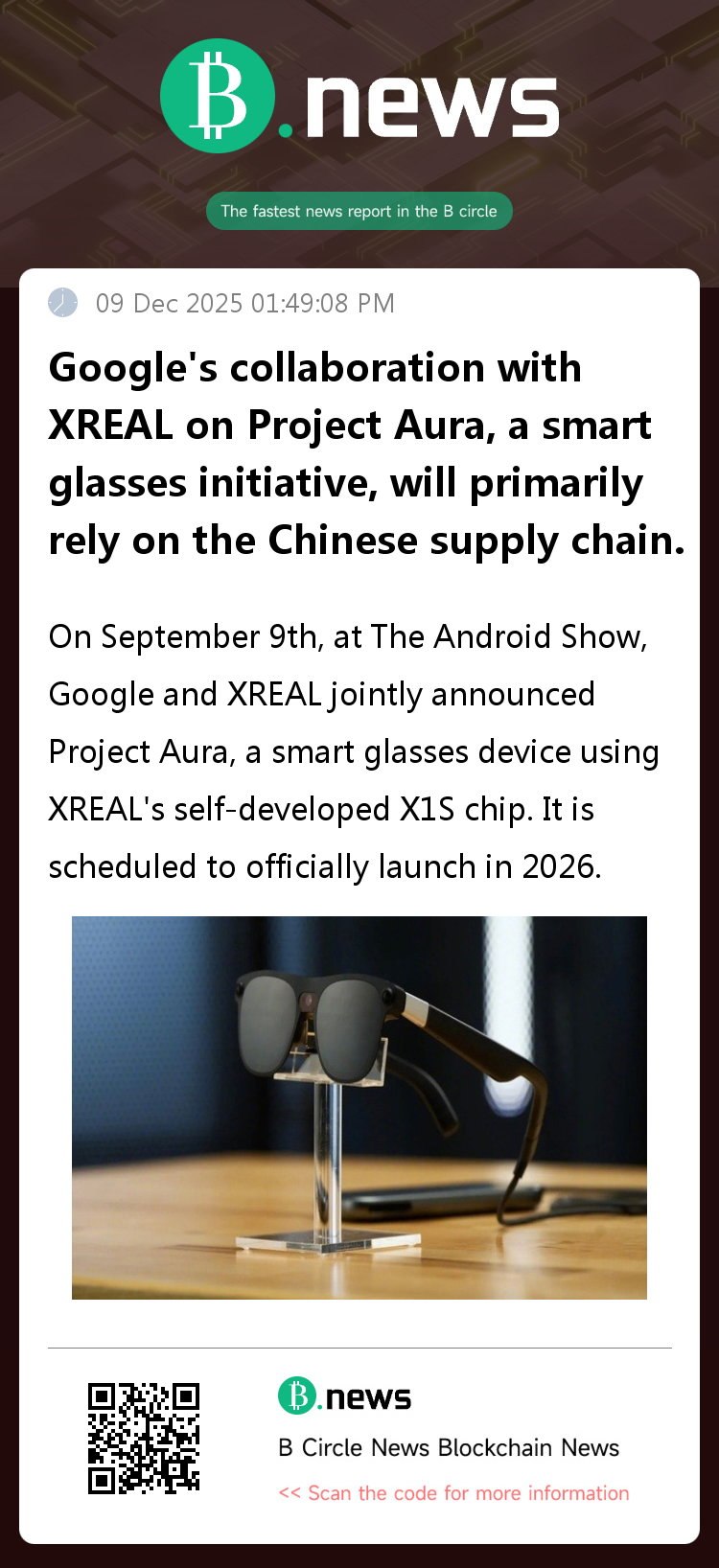 On September 9th, at The Android Show, Google and XREAL jointly announced Project Aura, a smart glasses device using XREAL's self-developed X1S chip. It is scheduled to officially launch in 2026. Almost all of Project Aura's hardware development and manufacturing were completed by a Chinese team. The X-Prism optical system was independently developed and mass-produced by the Chinese team, while the X1S spatial computing chip was designed and developed by XREAL. The supply chain is based in the Yangtze River Delta region, with Shanghai serving as XREAL's global R&D and future AI terminal innovation center. Suppliers such as Longcheer Technology and Luxshare Precision will provide support.